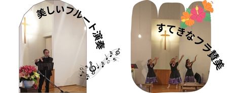 アドベント第2週の土曜日の午後、クリスマス音楽祭が行われました。大泉バプテスト教会より4人の方々をお迎えし、フラダンスやフルートやトーンチャイムでクリスマスをお祝いしました。(参加者約45人)